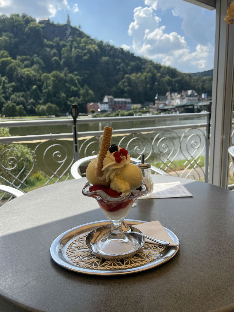 dort im cafe ein leckeres eis verputzt - direkt mit blick auf trarbach.